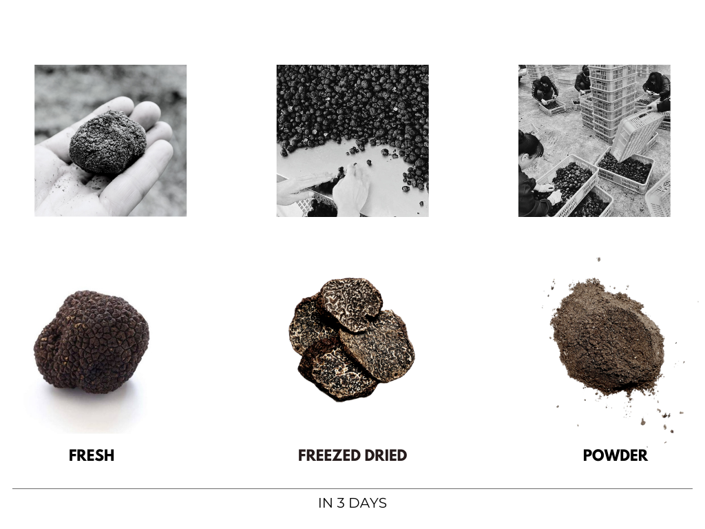 Finally, the truffles are finely ground into powder, capturing the essence of fresh black truffles in a shelf-stable.